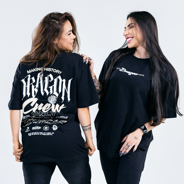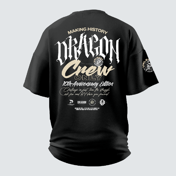O design frontal minimalista com o logo Dragon ganha ainda mais exclusividade com os detalhes em alto-relevo — o “D” e o selo comemorativo dos 10 anos. Nas costas, a estampa imponente “Dragon Crew Only – Making History” reforça o espírito de união e evolução da comunidade Dragon.
